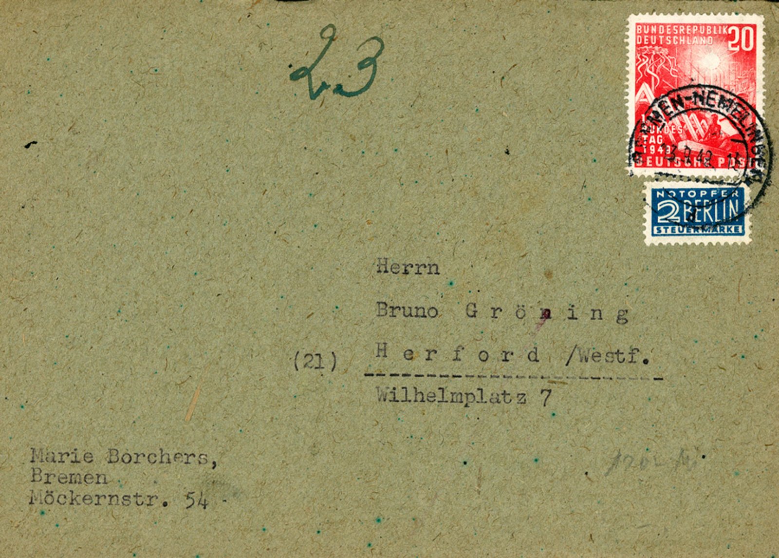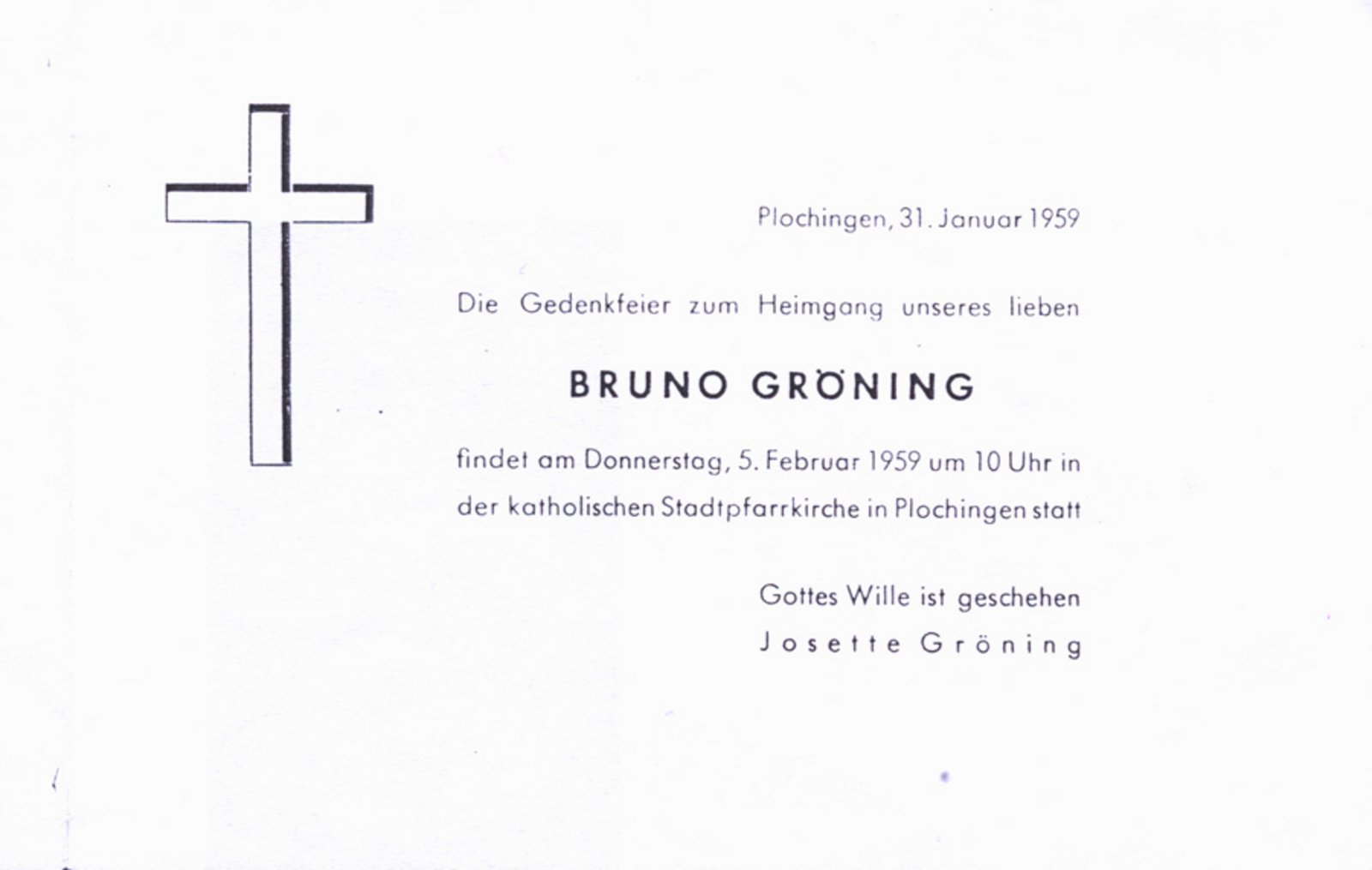 Filmplakat des verschollenen Dokumentarfilms „Gröning“ aus dem Jahre 194910.6.1949: Umschlag eines an Bruno Gröning in Herford adressierten Briefs22.6.1949: Umschlag eines an Bruno Gröning in Herford adressierten Briefs2.2.1946: Bruno Grönings Ausweis des „Hilfsdienst der aus Böhmen und Mähren-Schlesien vertriebenen Deutschen im Dillkreis“15.2.1950: Signierte Visitenkarte Bruno Grönings13.9.1949: Umschlag eines an Bruno Gröning in Herford adressierten Briefs31.1.1959: Einladungskarte zur Gedenkfeier anlässlich von Bruno Grönings Tod „Die Gedenkfeier zum Heimgang unseres lieben Bruno Gröning findet am Donnerstag, 5. Februar 1959 um 10 Uhr in der katholischen Stadtpfarrkirche in Plochingen statt. Gottes Wille ist geschehen. Josette Gröning“Grabstätte Bruno Grönings in Dillenburg (Hessen)undatiert: Visitenkarte Bruno Grönings