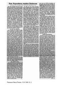 Passauer Neue Presse, 10.9.1949: "Kein Hypnotiseur, sondern Seelenarzt" - Textfassung