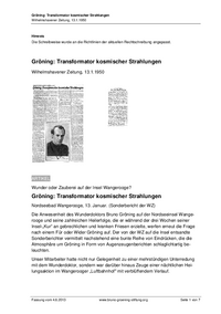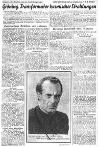 Wilhelmshavener Zeitung, 13.1.1950: 'Gröning: Transformator kosmischer Strahlungen' - Textfassung